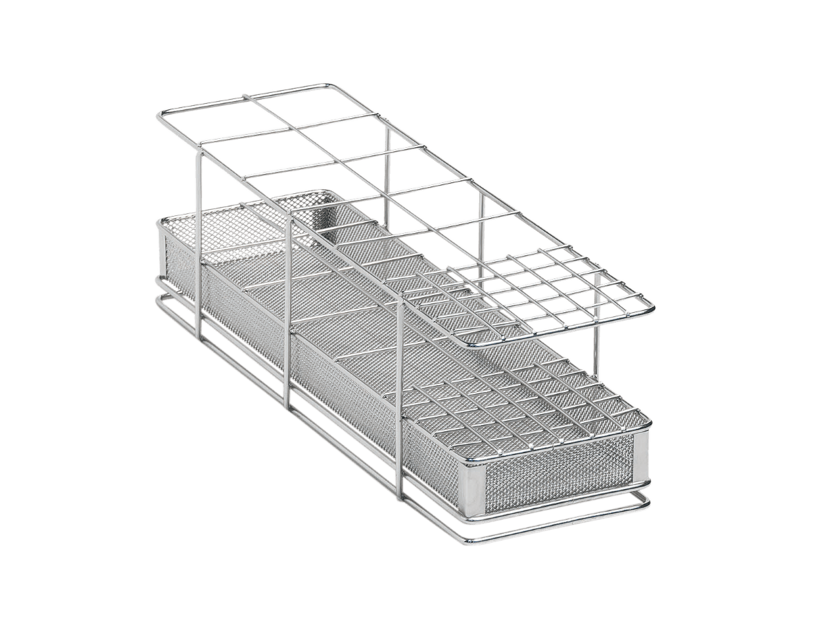 Korbeinsatz für stehende Instrumente im Thermodesinfektor. Zur maschinellen Reinigung und Desinfektion von Scheren, Zangen, Mundspiegeln und anderen stehenden Instrumenten im Eurosafe 60.
